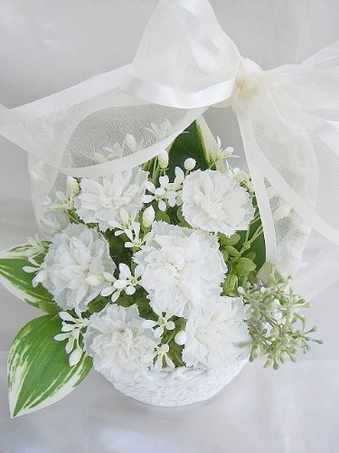 白いカーネーションが映える グリーンとのコントラストが清々しい 白い花籠に入ったアレンジ