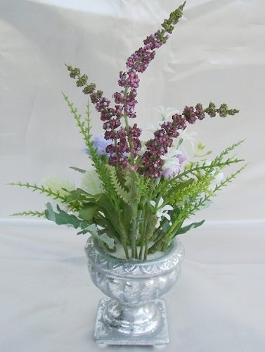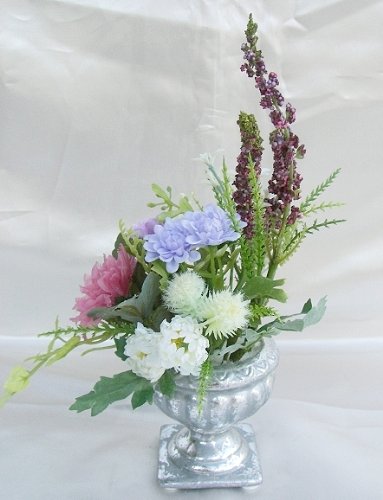 - 花材 プリザーブドキャンディーマム・フェイク小花・フェイクリーフ 花瓶 陶器(シルバー塗装)
