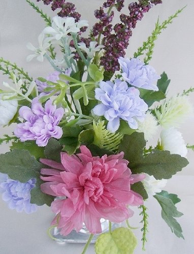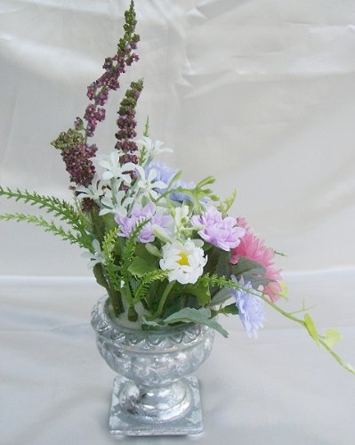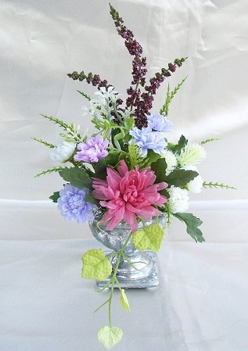 ギフト対応 野の花をあしらったような優しいナチュラルなアレンジ プリザーブドフラワーは真ん中のピンク色のキャンディーマムです サイズ 横幅12×奥行10×高さ22cm 花材 プリザーブドキャンディーマム・フェイク小花・フェイクリーフ 花瓶 陶器(シルバー塗装) お彼岸・お盆・帰省・御供のギフトに人気です