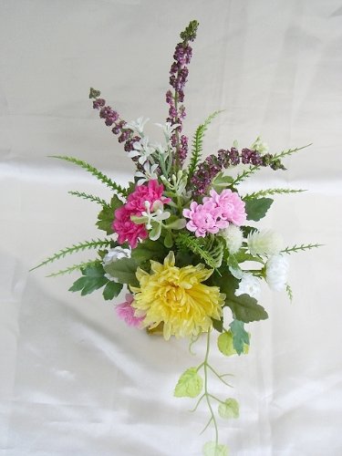 野の花をあしらったような優しいナチュラルなアレンジ プリザーブドフラワーは真ん中の黄色のキャンディーマムです