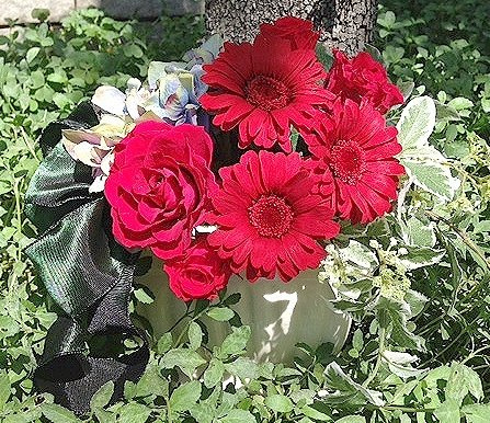 新緑に目にも鮮やかなスカーレットレッドのお花をアレンジ 生き生きとしたガーベラとバラが 華やかさと可愛らしさを醸し出します 記念日の贈り物や感謝の気持ちが伝わる逸品です