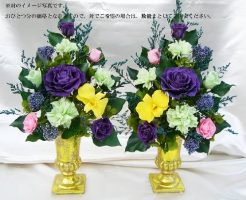 ギフト対応 豪華な仏花アレンジです サイズ:幅20×奥行15×高さ32cm 花器:陶器 花材:プリザーブドローズ・プリザーブドデンファレ・プリザーブドカーネーション・プリザーブドライスフラワー・プリザーブドアジサイ・プリザーブドブルーファンタジア・プリザーブドアイビーリーフ すべてプリザーブド素材です