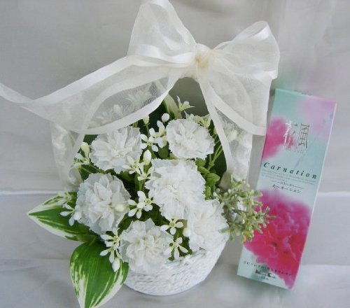 お仏壇のお供え 仏花 清華せいか かごに入った白いカーネーションのアレンジ プリザーブドフラワーと日本香堂の薫り高いお線香のセット