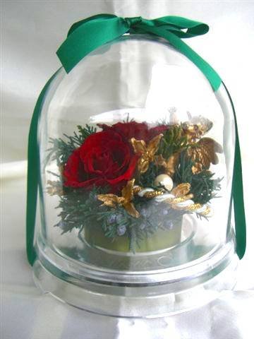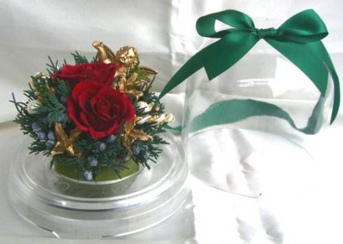 ギフト対応 ドームの中にクリスマスムードをぎゅっと閉じ込めました ちょっとしたスペースもクリスマスカラーで飾ってみてはいかがですか お好みでフタを開けて飾っていただけます プレゼントに最適な一品です。 サイズ:約直径13×高さ15cm、 花材:プリザーブドローズ・マウンテンジェニパー・ゴールドの実・コードリボン・ゴールドエンジェルピック