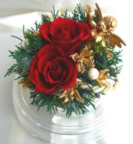 ドーム入りゴールドエンジェルと2輪の赤いバラ プリザーブドフラワー