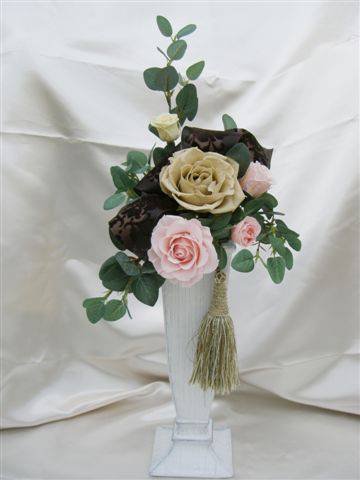 ギフト対応 ベージュと淡いピンク色のハーモニーをきりりと引き締める上品なカフェ色のリボン。 花器に下げたタッセルとシルエットが中世の舞踏会を連想させるノスタルジックなアレンジです スレンダーなシルエットなのでニッチなどの幅のないところにも飾れます。 新築祝い・結婚祝い・各種お祝い事に向いています。 花器:陶器 サイズ:幅20×奥行20×高さ50cm 花材:プリザーブドローズ・フェイクユーカリ・リボン・タッセル