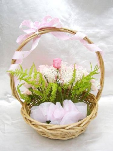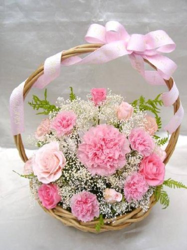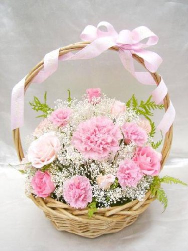ピンク色のバラとカーネのグラデーションフワッフワッなカスミ草バスケットアレンジ