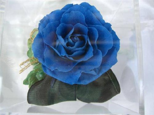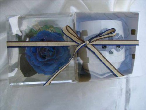 ギフト対応 ロイヤルブルーの大輪のバラと有田焼香酒盃のセット。 日頃の感謝の気持ちをこめてお父さんにプレゼントしてはいかがですか ? アレンジサイズ:10cm角アクリルキューブ 花材:プリザーブドローズ・アジサイ・リボン