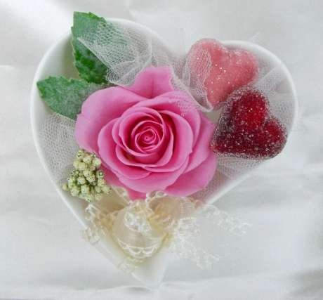 ギフト対応 ちょっとしたプレゼントにピッタリのシュガーハートアレンジ サイズ:幅10×奥行10×高さ6.5cm 花器:陶器(白) 花材:プリザーブドローズ・プリザーブドライスフラワー・シュガーハート・フェイクリーフ・チュール・リボン