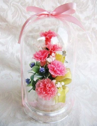 Lサイズのドームの中にピンク色のカーネーションを中心にした花束を閉じ込めました。 母の日のプレゼントにうってつけのドームアレンジ! 上品な仕上がりなのでどんなギフトにもお薦めです。 優しいピンク色は見ている人の心まで優しい気分にしてくれます。 ホワイトデー・フラワーバレンタインデー・誕生日・バースデー・母の日・敬老の日など各種ギフトに人気です♪