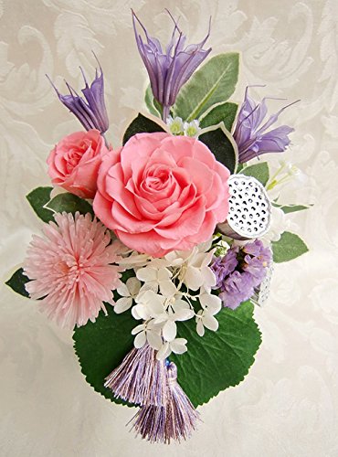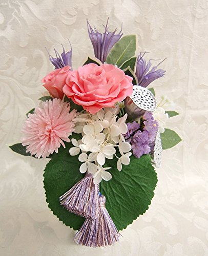 明るい色合いの仏花生前の明るいあの方にお似合いです 飾りの房は色が変わることがありますのでご了承ください 雰囲気に合ったアイボリーなどになりますのでご心配は無用です 花瓶付きなのでそのまま飾れお水替えの心配も不要です お盆・お彼岸・帰省・仏事のギフトに人気です