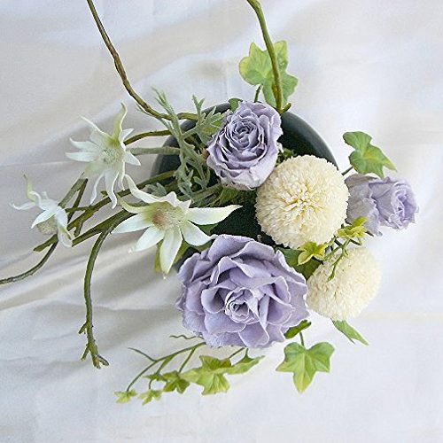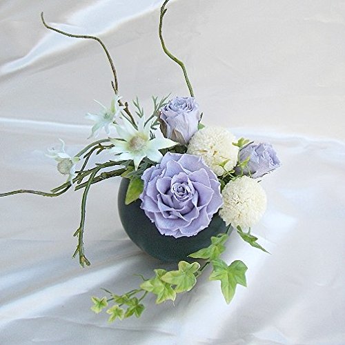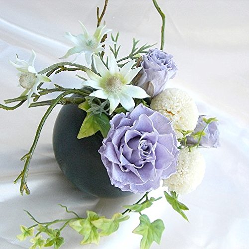 黒くて丸いコロンとした花器に 清楚な薄藤色の薔薇とクリーム色のピンポンマムと フランネルフラワーでアレンジしました 雲竜柳が風を受けてそよそよと動きます 和モダンなアレンジに仕上がりました 落ち着いたアレンジは、贈り物に最適!!