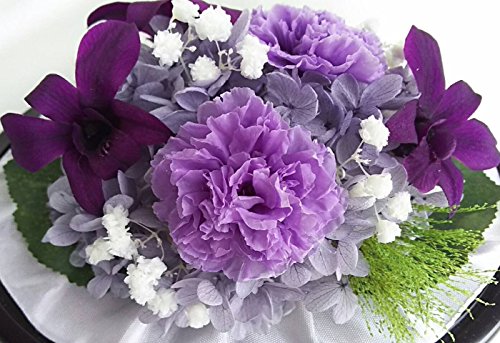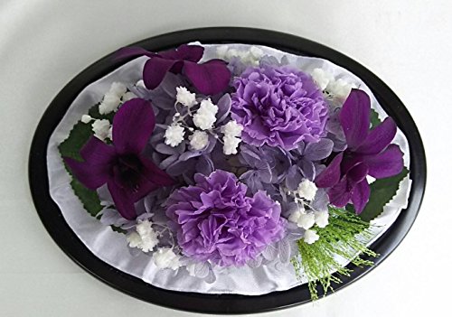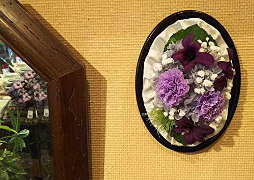 オーバルドームの中に花がギュッと詰まった壁掛けにもなる 紫のカーネーション とデンファレのアレンジ プリザーブドフラワー