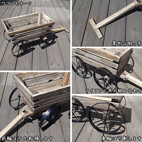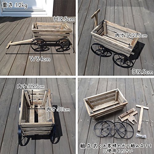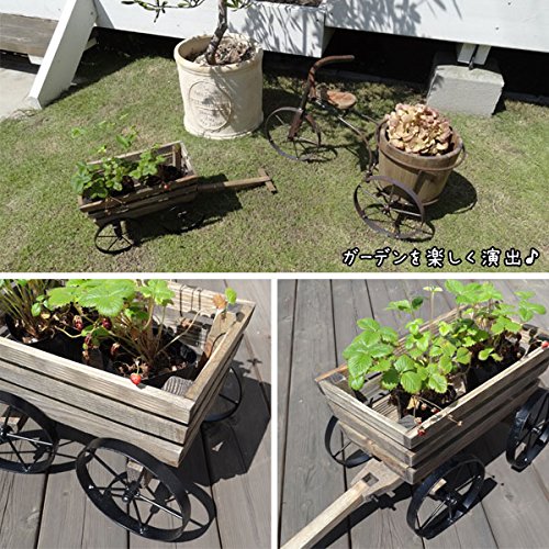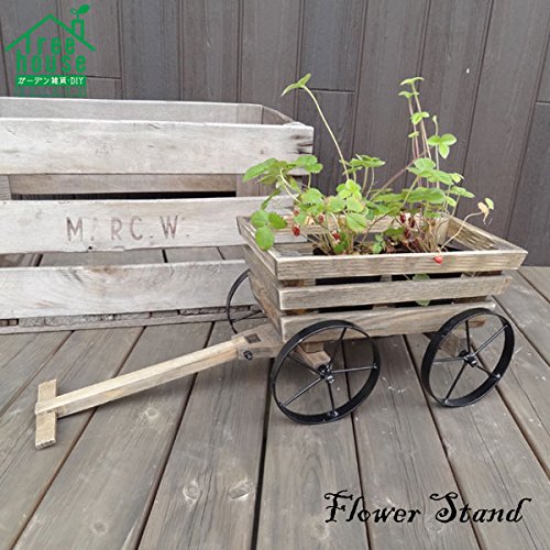 アンティーク調の木製フラワースタンド。木のぬくもりを感じる優しい雰囲気です。 ワゴンモチーフのスタンドです。 車輪は可動して、前輪は方向転換できるようになっています。 程よい大きさがガーデンやお部屋のインテリアのアクセントになります。 お花やグリーンを入れて飾るだけで、ガーデンを簡単に楽しく演出できます。 お部屋のインテリアとしてディスプレイするのも素敵です。 組立式になっているので、お客様の元で組み立ててご使用ください。 同じシリーズで他にもデザインございます。