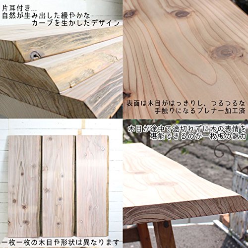 兵庫県産杉を使用した無垢の一枚板。 無垢一枚板の天板は、文字通り「一点もの」。 使うほど、お部屋に馴染んでいき愛着を感じるアイテムです。 自然の木から切り出された、木の素性が個性として前面に出る天板をお楽しみ下さい。 板は片耳付きで、耳付きというのは、樹皮が付いていた耳と呼ばれる部分を残して製作したもので、自然のカーブが美しいフォルムになっております。 厚み3cmのしっかりとした板なので、テーブルとしてはもちろん棚板としてのご使用も可能です。 表面は木目がよりはっきりと出て、つるんとした手触りになるようプレナー加工を施しております。 カフェや美容室、BARなどのお店の改装にも一役買ってくれそう。 自然木の持つぬくもりのある風合いと美しい木目に魅了される一枚です。 自然の素材を空間に取り入れて居心地の良いお部屋にしてみてはいかがでしょうか。