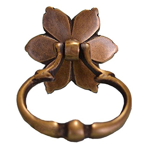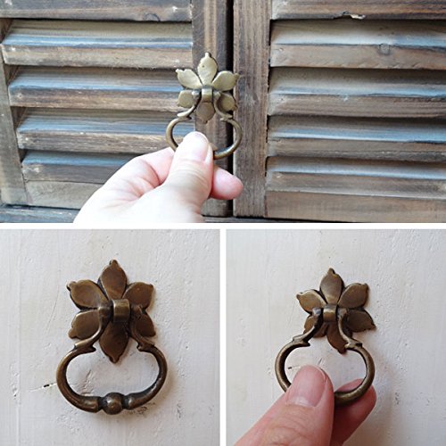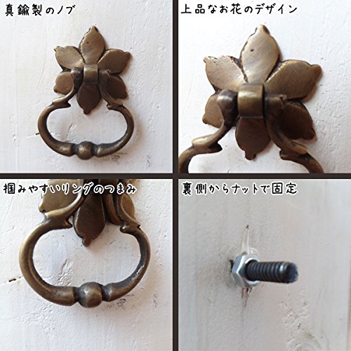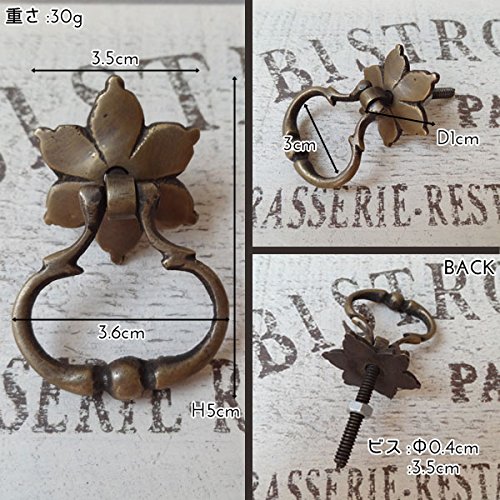 長い年月を経て変色したような味わいのある、まるでのアンティークのような古色仕上げの真鍮製取っ手です。上品で優雅な花びらのようなデザインの台座と、掴みやすいリングのつまみが特徴的。一点一点手作業で作られているので、それぞれ微妙に形や大きさ、色味が違っていて、その不揃いなバランスがハンドメイドならではの温もりがあります。真鍮ならではくすんだ輝きが魅力的で、屋外での使用でも錆びず、使えば使うほど味が出てくるのも嬉しいですね。わざと施されたアンティーク加工もとっても素敵な風合いで、外国の田舎町やパリのアパルトマンで使われているようなお洒落な家具のような雰囲気に。アンティーク商品に興味はあるけど、高そうで手が出ないそんな方に。取り付けも簡単なので、憧れのアンティーク家具もこんなに手軽に手に入れることができるんです。使い慣れた家具の引出しや扉のつまみを少しだけおめかしして、エレガントで上品なライフスタイルを楽しみましょう※1ヶです。●台座直径3cm×つまみ幅3.5cm×つまみ高さ3.8cm