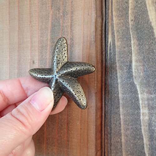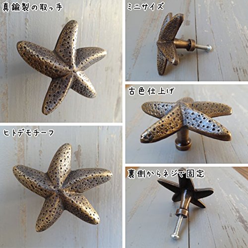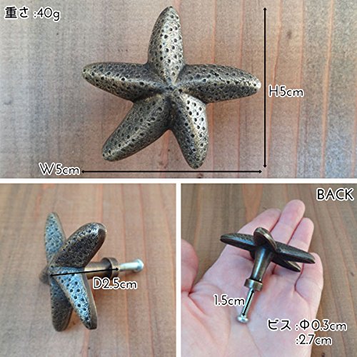 長い年月を経て変色したような味わいのある、まるでのアンティークのような古色仕上げの真鍮製取っ手です。お星様のようにも見える優しい雰囲気のヒトデモチーフが特徴的。一点一点手作業で作られているので、それぞれ微妙に形や大きさ、色味が違っていて、その不揃いなバランスがハンドメイドならではの温もりがあります。真鍮ならではくすんだ輝きが魅力的で、屋外での使用でも錆びず、使えば使うほど味が出てくるのも嬉しいですね。わざと施されたアンティーク加工もとっても素敵な風合いで、外国の田舎町やパリのアパルトマンで使われているようなお洒落な家具のような雰囲気に。アンティーク商品に興味はあるけど、高そうで手が出ないそんな方に。取り付けも簡単なので、憧れのアンティーク家具もこんなに手軽に手に入れることができるんです。使い慣れた家具の引出しや扉のつまみを少しだけおめかしして、エレガントで上品なライフスタイルを楽しみましょう※1ヶです。●直径5cm×奥行き2.5cm重さ:40g
