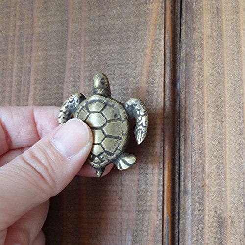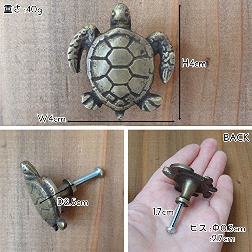長い年月を経て変色したような味わいのある、まるでのアンティークのような古色仕上げの真鍮製取っ手です。細部まで細かくデザインされた、ちょこんとした可愛い亀のモチーフが特徴的。一点一点手作業で作られているので、それぞれ微妙に形や大きさ、色味が違っていて、その不揃いなバランスがハンドメイドならではの温もりがあります。真鍮ならではくすんだ輝きが魅力的で、屋外での使用でも錆びず、使えば使うほど味が出てくるのも嬉しいですね。わざと施されたアンティーク加工もとっても素敵な風合いで、外国の田舎町やパリのアパルトマンで使われているようなお洒落な家具のような雰囲気に。アンティーク商品に興味はあるけど、高そうで手が出ないそんな方に。取り付けも簡単なので、憧れのアンティーク家具もこんなに手軽に手に入れることができるんです。使い慣れた家具の引出しや扉のつまみを少しだけおめかしして、エレガントで上品なライフスタイルを楽しみましょう※1ヶです。●W4cm×H4cm×D2.5cm重さ:40g