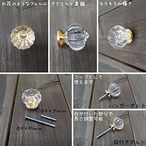 アクリル樹脂と真鍮の組み合わせのキラキラ輝くアクリルノブ。 ぷっくり可愛いお花のようなフォルムのノブです。 光の反射具合によって様々な表情の輝きを放ってくれる、キラキラとした透明感と 光の浸透性が素敵で、思わずずっと眺めていたくなります。 ボルトが2種類付属されています。 ハンガーボルトを使えば商品を取付面の全面から取り付けできます。 つまみをフックのようにお使い頂けます。 段付ボルトはボルトの段が付いた部分で長さ調整が簡単にできます。 ペンチを使って折り曲げれば簡単に切断できます。