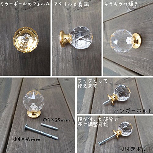 アクリル樹脂と真鍮の組み合わせのキラキラ輝くアクリルノブ。 ミラーボールのような形でキラキラ輝きが綺麗なノブ 光の反射具合によって様々な表情の輝きを放ってくれる、キラキラとした透明感と 光の浸透性が素敵で、思わずずっと眺めていたくなります。 ボルトが2種類付属されています。 ハンガーボルトを使えば商品を取付面の全面から取り付けできます。 つまみをフックのようにお使い頂けます。 段付ボルトはボルトの段が付いた部分で長さ調整が簡単にできます。 ペンチを使って折り曲げれば簡単に切断できます。