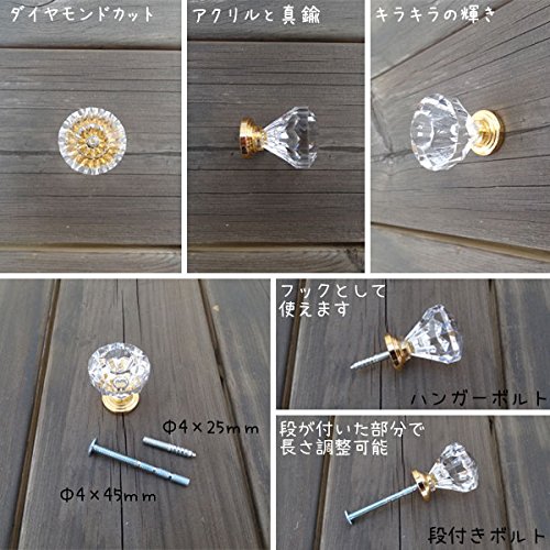 アクリル樹脂と真鍮の組み合わせのキラキラ輝くアクリルノブ。 ダイヤモンドカットのデザインでまるで本物の宝石のように綺麗に輝きます。 光の反射具合によって様々な表情の輝きを放ってくれる、キラキラとした透明感と光の浸透性が素敵で、思わずずっと眺めていたくなります。 ボルトが2種類付属されています。 ハンガーボルトを使えば商品を取付面の全面から取り付けできます。 つまみをフックのようにお使い頂けます。 段付ボルトはボルトの段が付いた部分で長さ調整が簡単にできます。 ペンチを使って折り曲げれば簡単に切断できます。