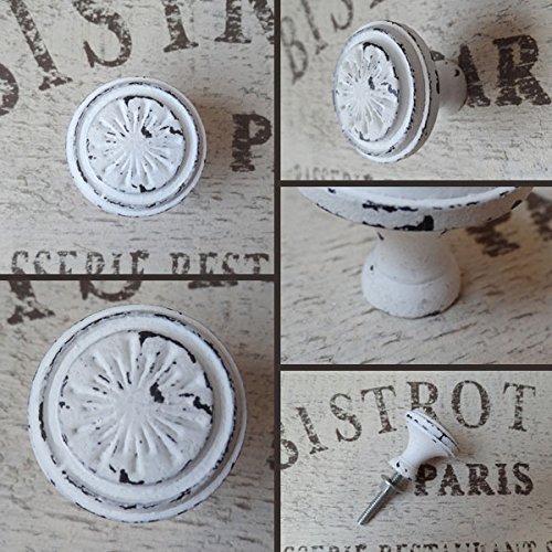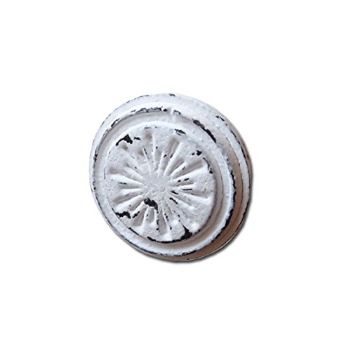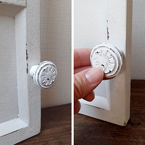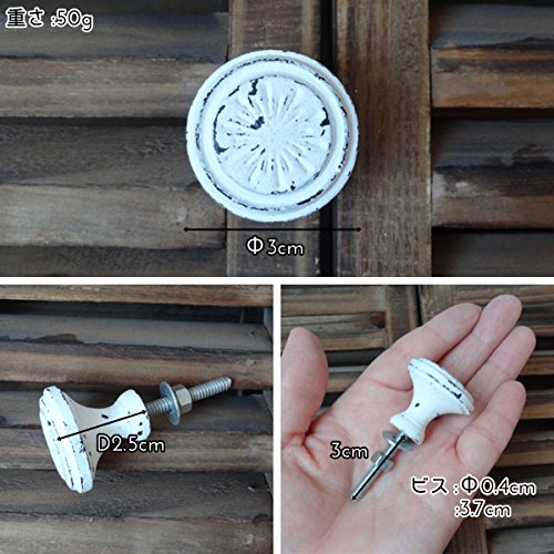 アンティーク調の雰囲気の空間にピッタリの鉄製のキャビネットノブシリーズです。 フレンチカントリー好きな方にオススメです。 シンプルなデザインのサークルモチーフにアンティークなホワイトカラーが特徴です。 いつもの家具にお洒落なノブを取り入れるだけで、お部屋の雰囲気や気分を変えて頂くことができます。 引き出しや、収納ボックスの取っ手として、お好きな所に付けてアレンジして下さい。 取り付けは裏側からナットで固定します。ネジ部分は板のサイズに合せてワッシャーを挟むかネジを専門の道具でカットするなど調節してください。 ヨーロッパ調の大人モダンなインテリアに早変わりします。 他にもデザインございます。