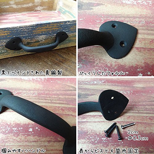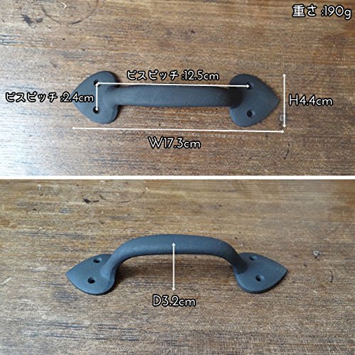 一見アイアン雑貨のように見えるけど、実はアイアンをイメージして味わい深くペイントされた真鍮製のドアハンドルなんです。ハンドメイドの暖かみある優しい印象と、ぷっくりしていてどこか可愛いデザインが特徴的。つかみやすいハンドルに加え、真鍮なので屋外での使用でも錆びず、実用性も装飾性も兼ね備えた優れもの。台座をおもてからビスで二箇所留めるだけで簡単に取り付ける事ができ、お気に入りの家具やキッチンキャビネット、小物入れ、チェストなどをあっと言う間に素敵に変身させてくれますよパインや白木、アンティーク風な木目調などに取り付けると、まるで外国の田舎町やパリのアパルトマンで使われているようなお洒落な家具のような雰囲気になり、より一層美しさが際立ちます。アンティーク商品に興味はあるけど、高そうで手が出ないそんな方に。あなただけの素敵なイメージを膨らませて、素敵なプチリフォームにチャンレジしてみて下さいね※1個です。●全長17.3cm×幅4.4cm×高さ3.2cmビスピッチ:2.4cm/12.5cm重さ:190g