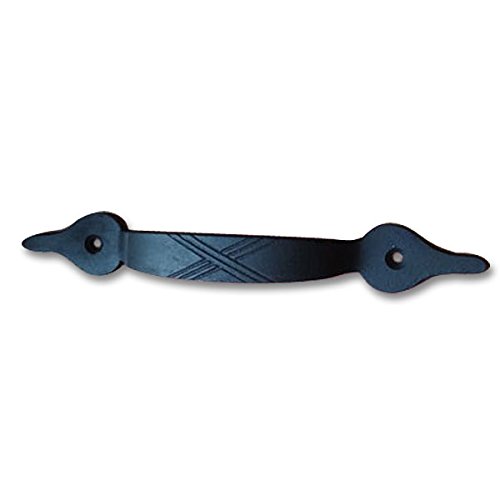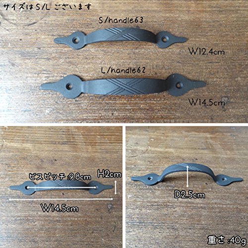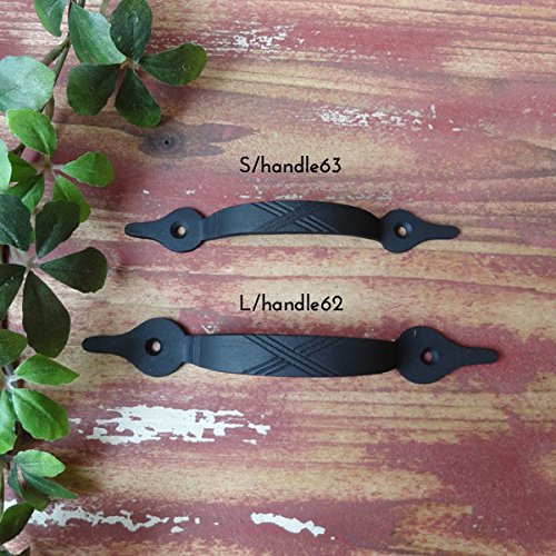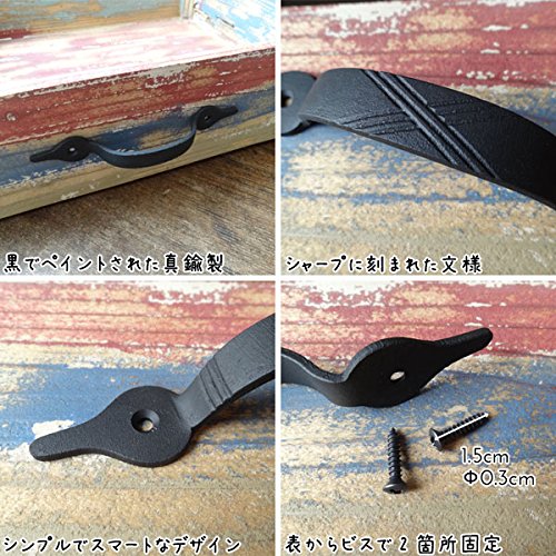 一見アイアン雑貨のように見えるけど、実はアイアンをイメージして味わい深くペイントされた真鍮製のドアハンドルなんです。ハンドメイドの暖かみある優しい印象と、シンプルでスマートなデザインが特徴的。つかみやすいハンドルに加え、真鍮なので屋外での使用でも錆びず、実用性も装飾性も兼ね備えた優れもの。台座をおもてからビスで二箇所留めるだけで簡単に取り付ける事ができ、お気に入りの家具やキッチンキャビネット、小物入れ、チェストなどをあっと言う間に素敵に変身させてくれますよパインや白木、アンティーク風な木目調などに取り付けると、まるで外国の田舎町やパリのアパルトマンで使われているようなお洒落な家具のような雰囲気になり、より一層美しさが際立ちます。アンティーク商品に興味はあるけど、高そうで手が出ないそんな方に。あなただけの素敵なイメージを膨らませて、素敵なプチリフォームにチャンレジしてみて下さいね※1個です。●全長14.5cm×幅2cm×高さ2.5cmビスピッチ:9.8cm重さ:40g