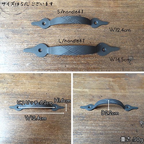 一見アイアン雑貨のように見えるけど、実はアイアンをイメージして味わい深くペイントされた真鍮製のドアハンドルなんです。ハンドメイドの暖かみある優しい印象と、シンプルでスマートなデザインが特徴的。つかみやすいハンドルに加え、真鍮なので屋外での使用でも錆びず、実用性も装飾性も兼ね備えた優れもの。台座をおもてからビスで二箇所留めるだけで簡単に取り付ける事ができ、お気に入りの家具やキッチンキャビネット、小物入れ、チェストなどをあっと言う間に素敵に変身させてくれますよパインや白木、アンティーク風な木目調などに取り付けると、まるで外国の田舎町やパリのアパルトマンで使われているようなお洒落な家具のような雰囲気になり、より一層美しさが際立ちます。アンティーク商品に興味はあるけど、高そうで手が出ないそんな方に。あなただけの素敵なイメージを膨らませて、素敵なプチリフォームにチャンレジしてみて下さいね※1個です。●全長12.4cm×幅1.6cm×高さ約2.2cmビスピッチ:約8.2cm重さ:30g