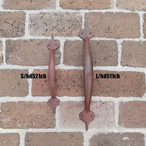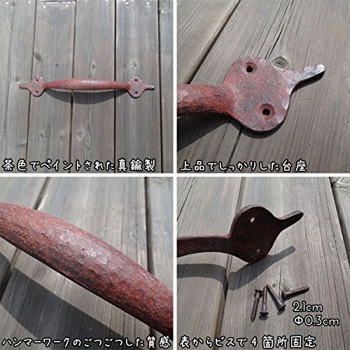 一見アイアン雑貨のように見えるけど、実はアイアンをイメージして味わい深くペイントされた真鍮製のドアハンドルなんです。手打ちのハンマーワークのごつごつした不揃いな表面が素敵で、手作り感たっぷり。しっかりした台座とつかみやすいハンドルに加え、真鍮なので屋外での使用でも錆びず、実用性も装飾性も兼ね備えた優れもの。台座をビスで4箇所留めるだけで簡単に取り付ける事ができ、ショップの入り口や扉のドアハンドルとしてはもちろん、お気に入りの家具やキッチンキャビネット、小物入れ、チェストなどをあっと言う間に素敵に変身させてくれますよパインや白木、アンティーク風な木目調などに取り付けると、まるで外国の田舎町やパリのアパルトマンで使われているようなお洒落な家具のような雰囲気になり、より一層美しさが際立ちます。アンティーク商品に興味はあるけど、高そうで手が出ないそんな方に。あなただけの素敵なイメージを膨らませて、素敵なプチリフォームにチャンレジしてみて下さいね