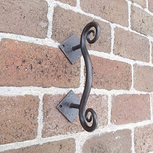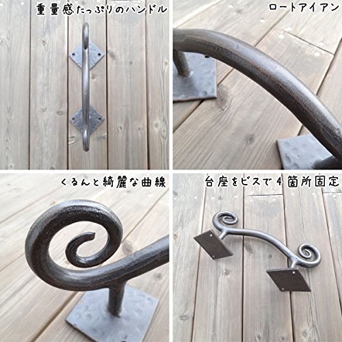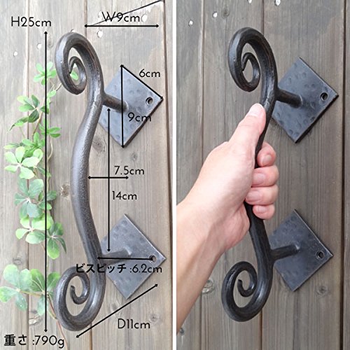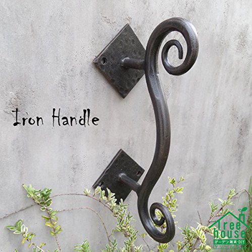 くるんと丸まった曲線が美しい、重量感たっぷりのアイアンドアハンドルです。どっしりとした大きくしっかりした台座と、つかみやすいハンドルで実用性に優れたデザインが特徴的。中世から伝わるヨーロッパの伝統工芸であるロートアイアンで作られており、手打ちのハンマーワークの質感と、火の中をくぐってきたくすんだ色目が味わい深い印象です。台座をビスで4箇所留めるだけで簡単に取り付ける事ができ、ショップの入り口や扉のドアハンドルとしてはもちろん、お気に入りの家具やキッチンキャビネット、小物入れ、チェストなどをあっと言う間に素敵に変身させてくれますよパインや白木、アンティーク風な木目調などに取り付けると、まるで外国の田舎町やパリのアパルトマンで使われているようなお洒落な家具のような雰囲気になり、より一層美しさが際立ちます。あなただけの素敵なイメージを膨らませて、素敵なプチリフォームにチャンレジしてみて下さいね※1ヶです。