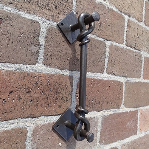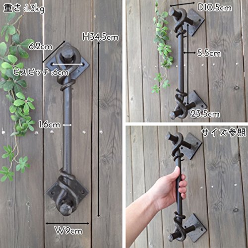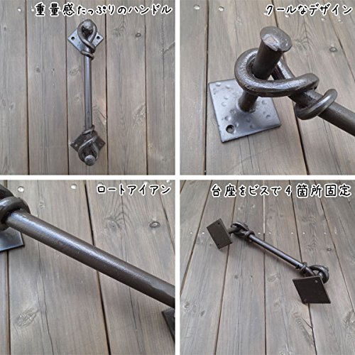 細かく繊細な手作業の技が光る、重量感たっぷりのアイアンドアハンドルです。どっしりとした大きくしっかりした台座と、つかみやすいハンドルで実用性に優れたデザインが特徴的。中世から伝わるヨーロッパの伝統工芸であるロートアイアンで作られており、手打ちのハンマーワークの質感と、火の中をくぐってきたくすんだ色目が味わい深い印象です。台座をビスで4箇所留めるだけで簡単に取り付ける事ができ、ショップの入り口や扉のドアハンドルとしてはもちろん、お気に入りの家具やキッチンキャビネット、小物入れ、チェストなどをあっと言う間に素敵に変身させてくれますよパインや白木、アンティーク風な木目調などに取り付けると、まるで外国の田舎町やパリのアパルトマンで使われているようなお洒落な家具のような雰囲気になり、より一層美しさが際立ちます。あなただけの素敵なイメージを膨らませて、素敵なプチリフォームにチャンレジしてみて下さいね※1ヶです。