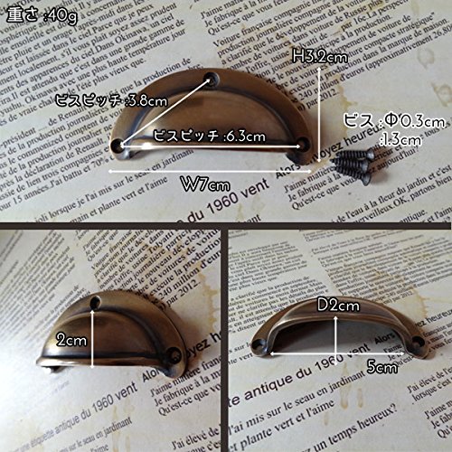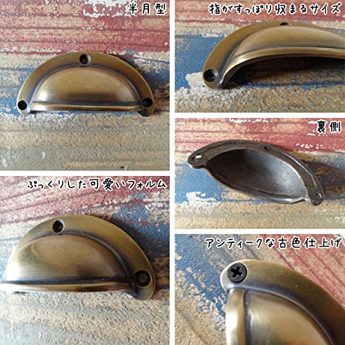 長い年月を経て変色したような味わいのある、まるでのアンティークのような古色仕上げの真鍮製取っ手です。指もすっぽり収まる掴み易い半月型の取っ手で、ぷっくりしていてどこか可愛いデザインが特徴的。一点一点手作業で作られているので、それぞれ微妙に形や大きさ、色味が違っていて、その不揃いなバランスがハンドメイドならではの温もりがあります。真鍮ならではくすんだ輝きが魅力的で、屋外での使用でも錆びず、使えば使うほど味が出てくるのも嬉しいですね。わざと施されたアンティーク加工もとっても素敵な風合いで、外国の田舎町やパリのアパルトマンで使われているようなお洒落な家具のような雰囲気に。アンティーク商品に興味はあるけど、高そうで手が出ないそんな方に。取り付けも簡単なので、憧れのアンティーク家具もこんなに手軽に手に入れることができるんです。使い慣れた家具の引出しや扉のつまみを少しだけおめかしして、エレガントで上品なライフスタイルを楽しみましょう※1ヶです。