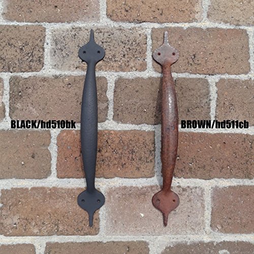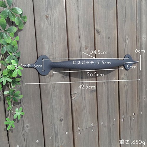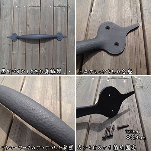 一見アイアン雑貨のように見えるけど、実はアイアンをイメージして味わい深くペイントされた真鍮製のドアハンドルなんです。 手打ちのハンマーワークのごつごつした不揃いな表面が素敵で、手作り感たっぷり。 しっかりした台座とつかみやすいハンドルに加え、真鍮なので屋外での使用でも錆びず、実用性も装飾性も兼ね備えた優れもの。 台座をビスで4箇所留めるだけで簡単に取り付ける事ができ、ショップの入り口や扉のドアハンドルとしてはもちろん、お気に入りの家具やキッチンキャビネットなどをあっと言う間に素敵に変身させてくれますよ!