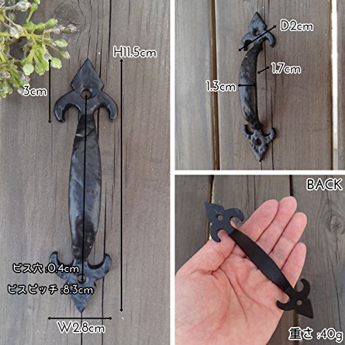 - サイズ:11.5cm(ビスピッチ8.3cm)×太さ1.3cm~2.3cm×厚さ0.3cm~0.5cm、取り付け時の板からの奥行き2cm、ビス穴:0.4cm※ハンドメイドの為サイズ・色味に若干誤差が生じる場合がございます