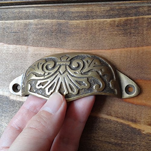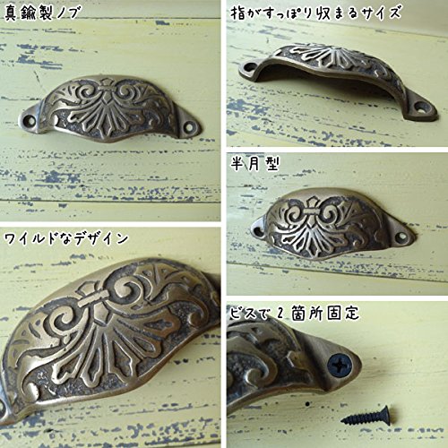 ワイルドなデザインが印象的な取っ手です。模様はエンボスで凹凸がある本格派。 長い年月を経て変色したような味わいのある、まるで本物のアンティークのような古色仕上げの真鍮製取っ手です。 指もすっぽり収まる掴み易い形の取っ手で、曲線デザインが特徴的。 一点一点手作業で作られているので、それぞれ微妙に形や大きさ、色味が違っていて、その不揃いなバランスがハンドメイドならではの温もりがあります。 真鍮ならではくすんだ輝きが魅力的で、屋外での使用でも錆びず、使えば使うほど味が出てくるのも嬉しいですね。