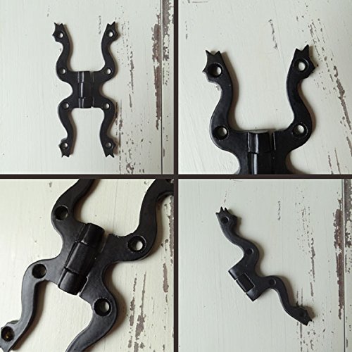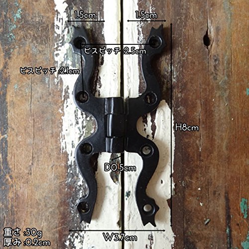 アンティークな雰囲気のアイアンヒンジ(蝶番)です。 繊細な細工が施され、アイアンの重厚な色合いが素敵なヒンジです。 扉の蝶番を変えるだけで、いつもの扉がアンティーク調のインテリアに早変わりします。 重量感のあるアイアンパーツが扉に深みと表情を作り出します。 しっかりした作りでカントリーテイストのお部屋にピッタリです。 大人のお部屋にピッタリなアンティークテイストの雑貨です。 お手頃な価格なのも嬉しいですね。 他にもデザインございます。