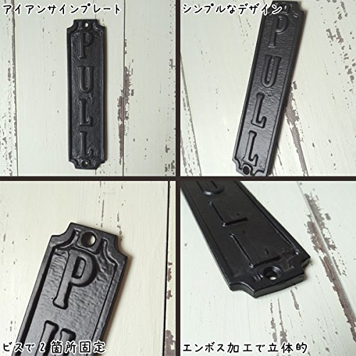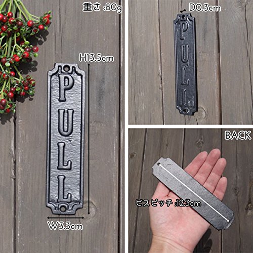アンティークな雰囲気のアイアンサインプレートです。 PULLの文字がエンボス加工されたシンプルなデザインで見やすいです。 繊細な細工が施され、アイアンの重厚な色合いが素敵なプレートです。 重量感のあるアイアンパーツが扉に深みと表情を作り出します。 しっかりした作りでカントリーテイストのお部屋にピッタリです。 大人のお部屋にピッタリなアンティークテイストの雑貨です。 PUSHもございます。