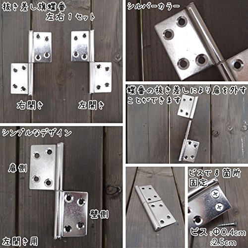 シンプルなデザインのシルバーカラーの抜き差し旗蝶番です。 ヒンジの抜差しにより扉を外すことができます。 観音開き扉用のヒンジです。 左右用で2個1セットです。 シンプルでインテリアスタイルを選ばず、どんな雰囲気のお部屋にも合うスマートなデザインが魅力的。 メタル素材の質感がインテリアのお洒落なワンポイントになります。 スタイリッシュなインテリアにピッタリなアイテムです。 他にもサイズございます。