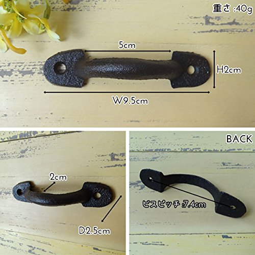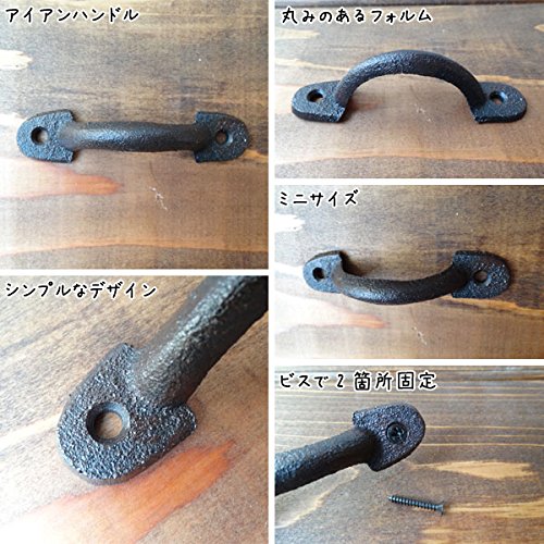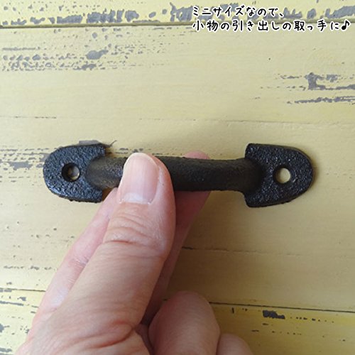 シンプルなデザインのアイアンのハンドルです。 丸みのあるフォルムの可愛い雰囲気です。 アンティークな個性を発揮する、ハンドメイドな質感がいい感じです。 取り付けはビスで2箇所固定するだけです。 手作りの雰囲気あふれるアイテムをDIYに取り入れてみては。 ミニサイズなので、小物の引き出しの取っ手などにおすすめです。