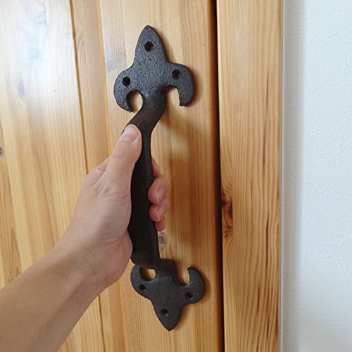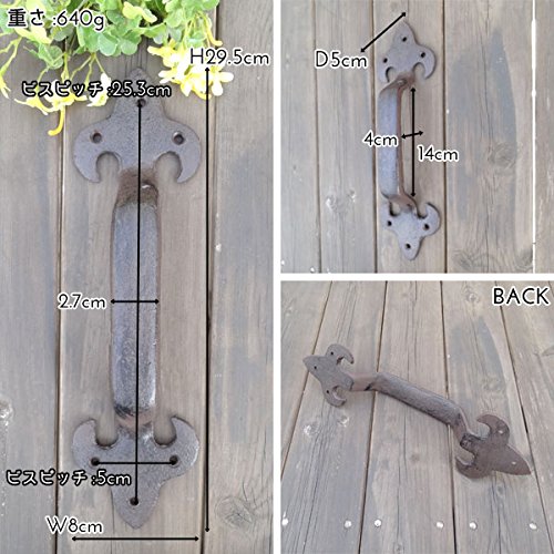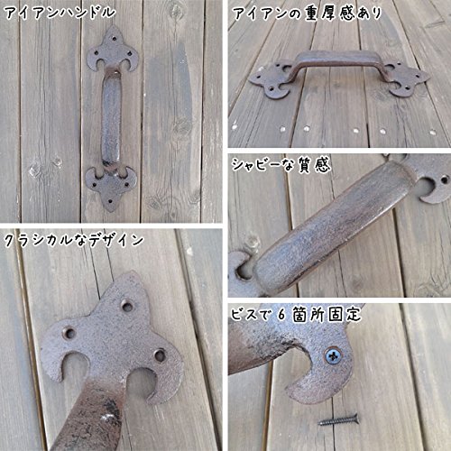 クラシカルなデザインのアイアンのハンドルです。 シャビーなアイアンの大きめハンドルです。 扉を華やかに演出してくれます。 アンティークな個性を発揮する、ハンドメイドな質感がいい感じです。 取り付けはビスで6箇所固定します。 手作りの雰囲気あふれるアイテムをDIYに取り入れてみては。 いつものドアのハンドルを替えて、プチリフォームにおすすめです。