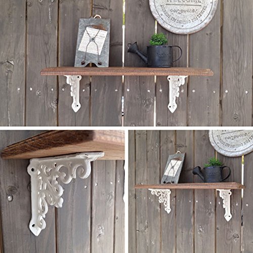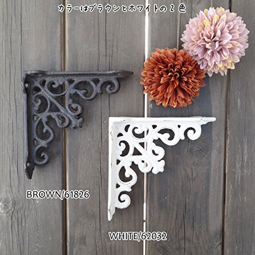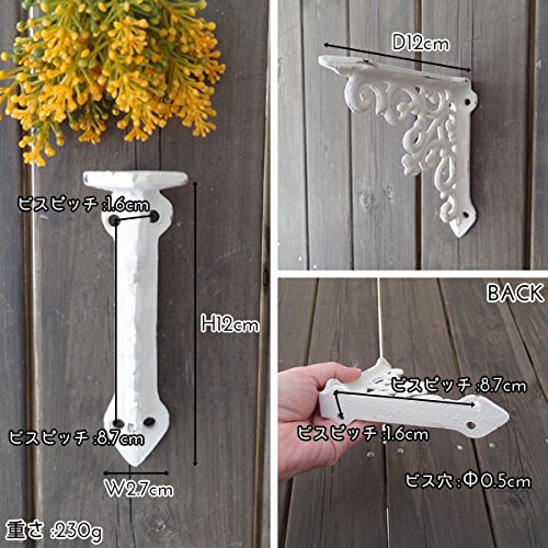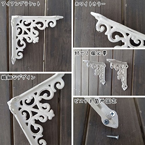 繊細なデザインと丈夫さが魅力のアンティーク調アイアンブラケットです。棚板を用意し、ビスで留めるだけで簡単に取り付ける事ができ、素敵なディスプレイゾーンや収納スペースを簡単に作れる便利アイテム。細部までこだわって作られたデザインは、日に当たるとその影が壁や床に映し出され、それまでもがインテリアのような計算された美しさです。アンティーク感を出すためにわざと古びたように加工された素材感は、憧れのアンティークの似合うお部屋を演出してくれます。簡単な収納や、本棚、ガーデンディスプレイ、お気に入りの小物のディスプレイゾーンなど、場所も用途も選びません。雑貨屋さんやカフェなどのお洒落なインテリアをイメージして、自分好みの素敵なお部屋作りを楽しんでくださいね※この商品は1ヶです。※白いネジは取り付けの際、ペイントが剥げてしまう恐れがある為、日本製の黒いビスを付属しております。※この商品は壁の強度によって耐荷量が変わってしまいますので、明確にお答えする事ができません。あまり重い物を置いてしまうと耐えられない恐れが御座います。