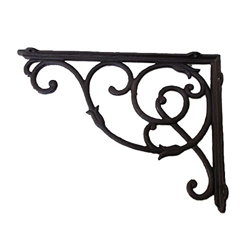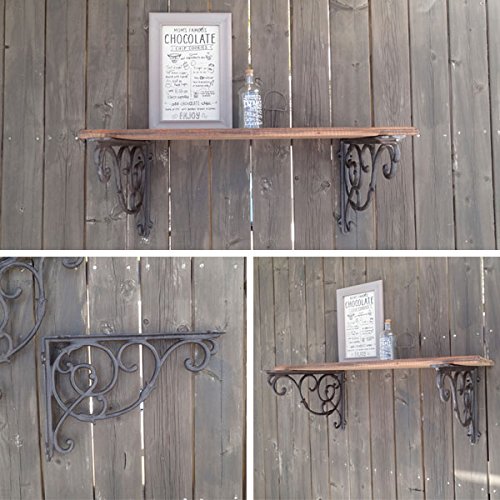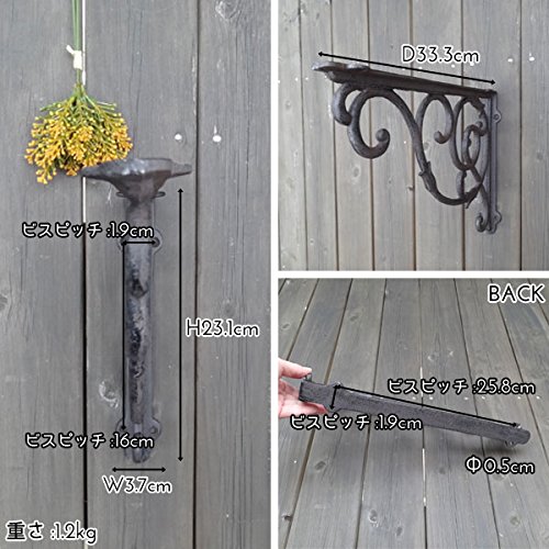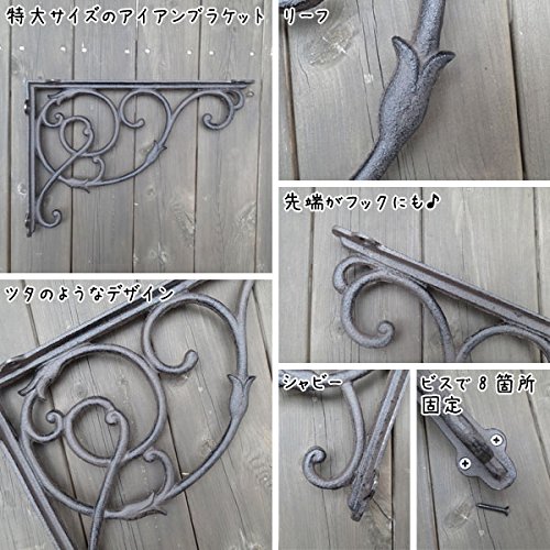 奥行き(長い方)33.5センチの大きめサイズです。 アイアンの曲線デザインが魅力のブラケットです。 アンティーク調アイアンブラケットです。 棚板を用意し、ビスで留めるだけで簡単に取り付ける事ができ、素敵なディスプレイゾーンや収納スペースを簡単に作れる便利アイテム。 アンティーク感を出すためにわざと古びたように加工された素材感は、憧れのアンティークの似合うお部屋を演出してくれます。 どちらを壁側にしても使えるデザイン・仕様です。 取り付けビスが付属しています。