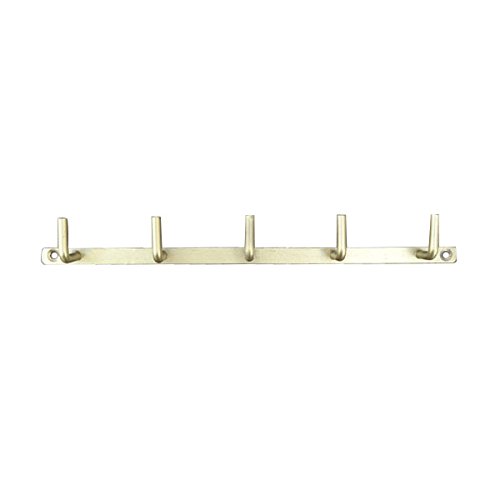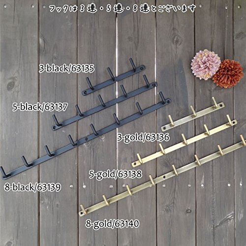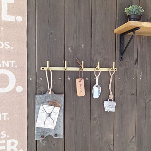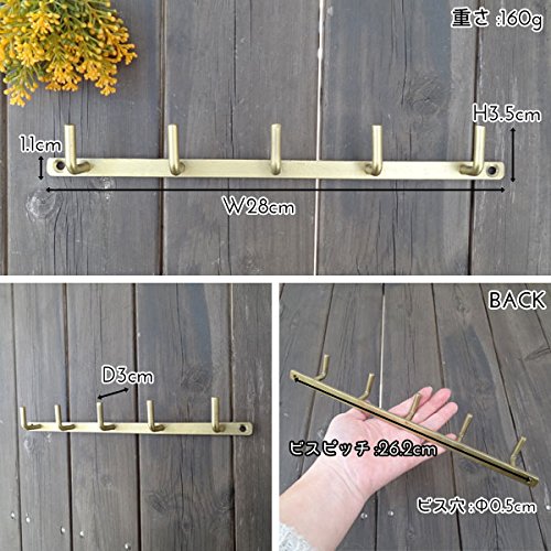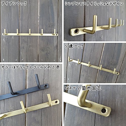 アンティークな雰囲気のアイアンの5連フックです。 アンティークなゴールドカラーが印象的です。 シンプルなデザインがスタイリッシュな雰囲気です。 シンプルなので掛けやすいです。 アンティークな雰囲気がお洒落で壁面のアクセントにもなります。 インテリアスタイルを選ばす、どんな場所にも馴染みやすいです。 取り付けはビスで2箇所固定します。 カラーはブラックとアンティークゴールドの2色ございます。 フックはシングル・3連・5連・8連とございます。 いくつか並べて付けると素敵です。 ※ビス付き