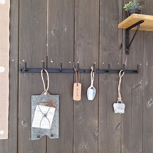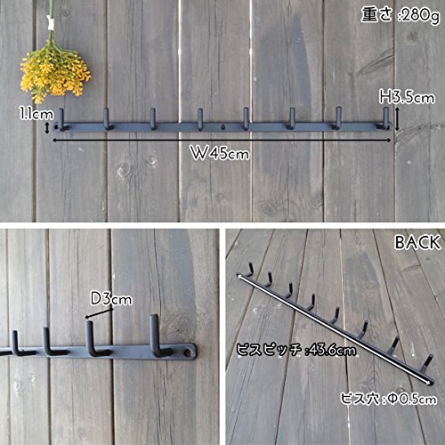 アンティークな雰囲気のアイアンの8連フックです。 深みのあるブラックカラーが印象的です。 シンプルなデザインがスタイリッシュな雰囲気です。 シンプルなので掛けやすいです。 アンティークな雰囲気がお洒落で壁面のアクセントにもなります。 インテリアスタイルを選ばす、どんな場所にも馴染みやすいです。 取り付けはビスで2箇所固定します。 カラーはブラックとアンティークゴールドの2色ございます。 フックはシングル・3連・5連・8連とございます。 いくつか並べて付けると素敵です。 ※ビス付き