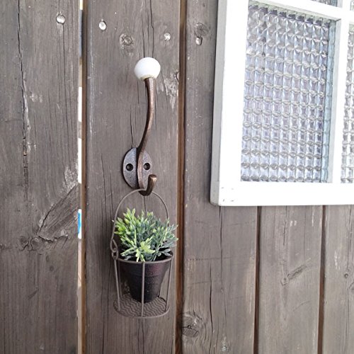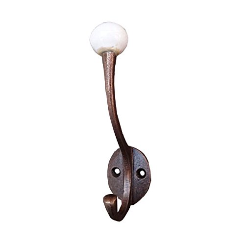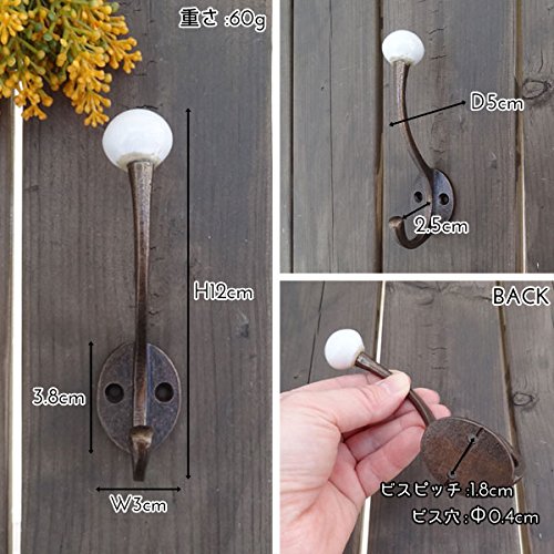 鉄製のシンプルなダブルフックです。 コロンとしたホワイトカラーのセラミックボールがポイントです。 コートやカバンや帽子など、簡単に掛けることができるフックでお部屋を整理整頓しちゃいましょう。 取り付けネジ付きで、ネジで2箇所固定して取り付けます。 アンティーク調でインテリアとしても素敵なアイテムです。 ひとつだけさりげなく取り付けても可愛いですし、いくつか並べて設置してもお洒落です。 お洒落なフックを取り入れて、お部屋の雰囲気や気分に変化を♪