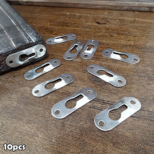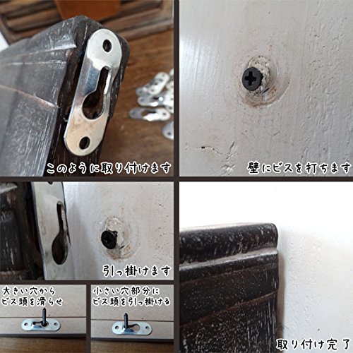 キーホール吊り金具10個セットです。 壁に直接設置する家具や鏡、額の吊り下げに便利です。 表面から吊り金具が見えないので、すっきりと飾ることができます。 取り付ける物の裏側に金具分の穴をノミなどで開け、金具をビスで二箇所固定します。 壁に埋め込んであるビスの頭にひっかけて固定します。 大きい穴からビス頭を滑らせて、小さい穴部分にビス頭を引っ掛けて固定します。 家具を壁と並行に取り付けたい時にオススメです。 吊り金具用ネジ付(20本付き)です。