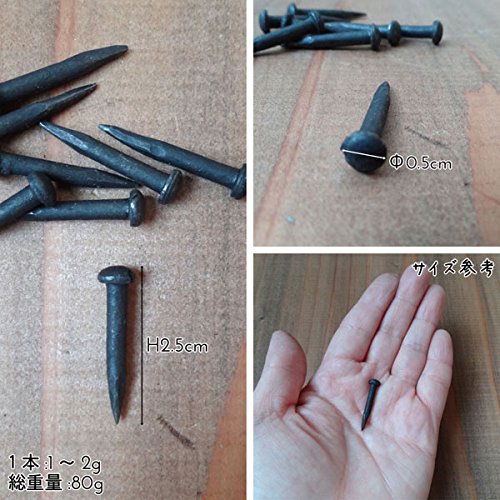 わざと歪みのある形に仕上げた、1本1本の表情の違いが味わい深いアイアンネイルです。普通の釘にはないアイアンならではの古びたアンティーク感があり、シンプルですがハンドメイドだからこそ出せる素朴さと温かみがたっぷり。先端は普通の釘ほど尖っておらず、普通の釘と同じような強度があるわけではありませんので、思い切り打ち付けたりすると破損する恐れがあります。板などに打つ際は、あらかじめキリなどで小さい穴を開けて打って下さいね。古材などに打ち付けるのが特にで、雰囲気たっぷりのオリジナルフック作りを楽しめますよそのままディスプレイとして打ち込んだり飾っても、とっても可愛いです。あなただけのオリジナリティー溢れる使い方を楽しんで下さいね