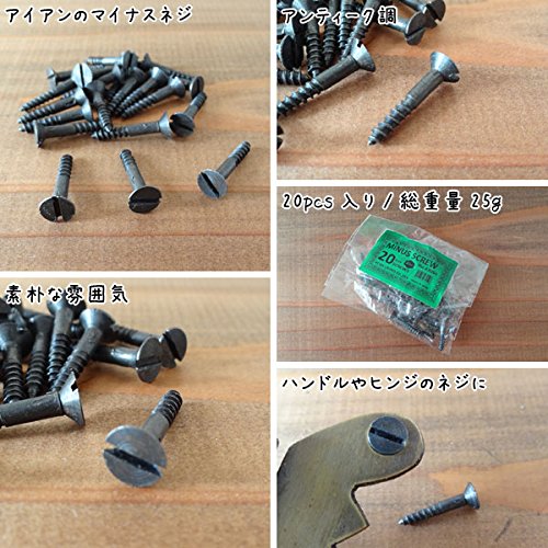 アイアンのマイナスネジです。 重量感あるアイアンのドアパーツです。 シンプルなデザインですが、アンティークな雰囲気がいい感じです。 アンティークな雰囲気に、ネジまでこだわりたい方にオススメです。 ドアハンドルやドアヒンジ(飾りヒンジ)などのネジとしても活用できます。 ネジの長さが3サイズございますが、取り付ける下地の厚みにもよりますので、用途に合ったネジをお選びください。 マイナスネジはプラスネジに比べ、取り付けが少し面倒な感じがしますが、素朴な雰囲気がオススメです。 大人のお部屋にぴったりなアンティークテイストな雑貨です。 重厚感あるアイアンパーツが扉に深みと表情を創り出します。 サイズは3サイズございます。 20pcs入り。