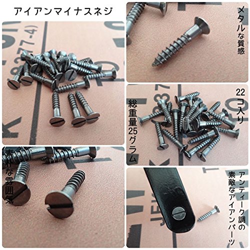 アイアンのマイナスネジです。 重量感あるアイアンのパーツです。 シンプルなデザインですが、アンティークな雰囲気がいい感じです。 アンティークな雰囲気に、ネジまでこだわりたい方にオススメです。 ドアハンドルやドアヒンジ(飾りヒンジ)などのネジとしても活用できます。 マイナスネジはプラスネジに比べ、取り付けが少し面倒な感じがしますが、素朴な雰囲気がオススメです。 大人のお部屋にぴったりなアンティークテイストな雑貨です。 重厚感あるアイアンパーツが扉に深みと表情を創り出します。 22pcs入り。